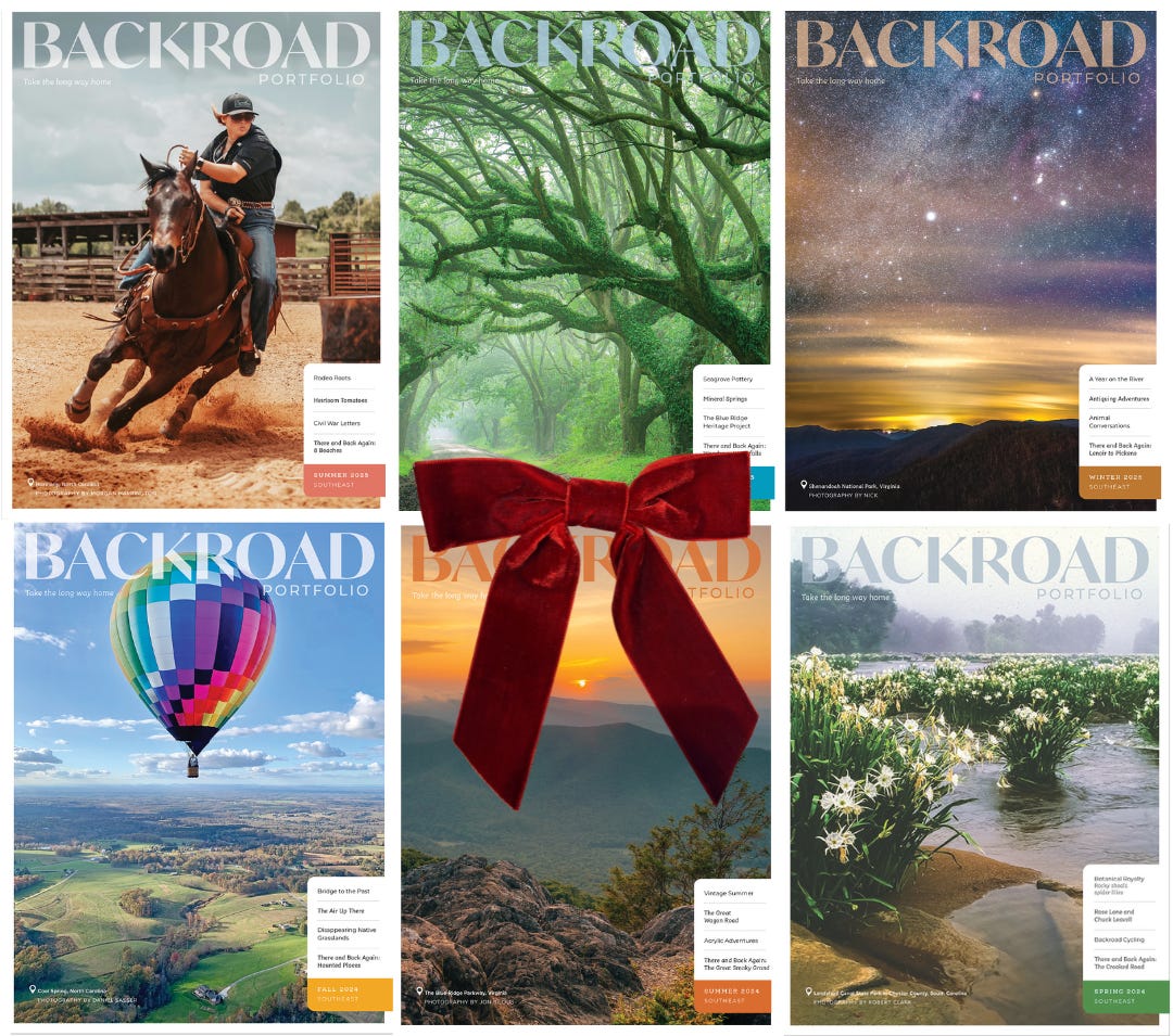 Introducing our 2025 Backroad Portfolio Holiday Gift Guide. Many of these items were created by southeastern artists and crafters featured in our 2025 issues. We’ve grouped them in the following categories: Food + Beverage, Home + Art, Clothing + Accessories, Travel Gear, Books, Animals, and Nonprofits + Charitable Causes.